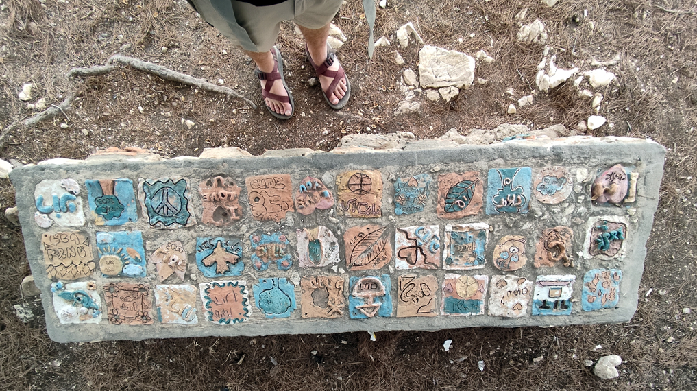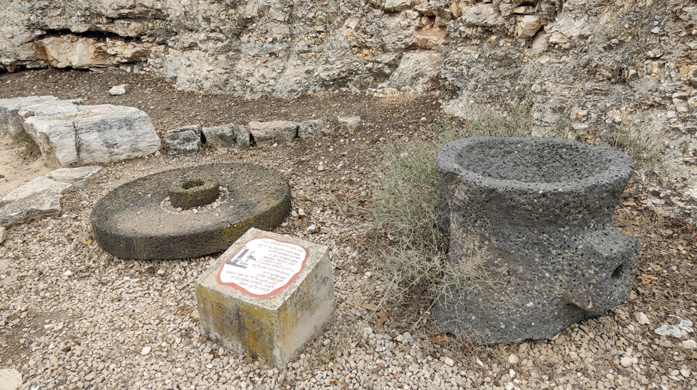 לאחר מנוחה קצרה בתצפית, נמשיך ללכת בשביל הצר המסומן בכחול, כשגדר כחולה מסתירה לנו את הנוף מצדנו הימני ועצי אלון מקיפים אותנו ומצלים על השביל. נעבור ליד כמה פריטים ארכיאולוגיים שמוצבים לצד השביל, עליהם נוכל להסביר לילדים, ובהמשך גם לצד ספסל אבן שעליו שמותיהם של הילדים שהכינו אותו. מהספסל נוכל להשקיף לכיוון מערב, שם נישא הר הכרמל, ומימינו מציצים מי הים התיכון ומפרץ חיפה. בימים בהירים נוכל אף להבחין בספינות שממתינות לתורן להיכנס לנמל חיפה, ועוגנות הרחק מהחוף.