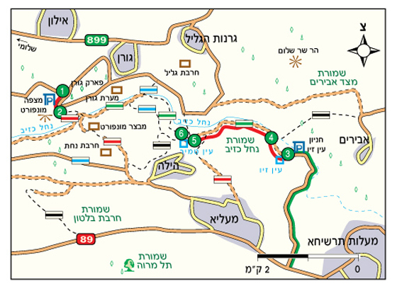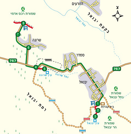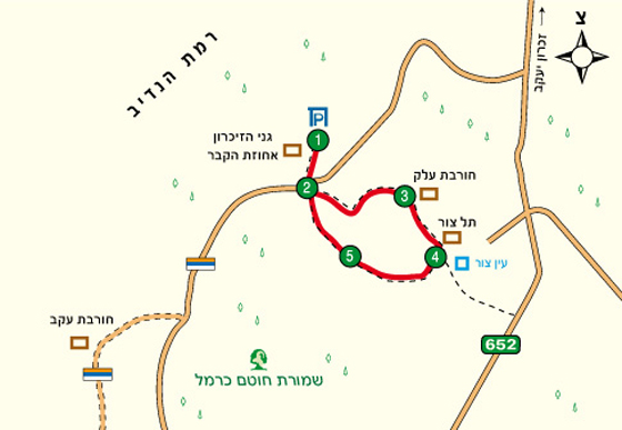 מסלול ההליכה בשמורת רמת הנדיב מתחיל ברחבת החנייה שבכניסה |1|, מזרחית לגני הזיכרון ולאחוזת הקבר של הברון אדמונד דה רוטשילד. הברון אדמונד בנימין ג’יימס דה רוטשילד, שזכה בכינוי “הנדיב הידוע”, היה אחד התומכים העיקריים ביישוב היהודי בארץ ישראל בתקופת העלייה הראשונה. הברון דה רוטשילד תרם כספים רבים לרכישת אדמות, ובכך הגדיל את כמות האדמות שהיו בידיים יהודיות בארץ ישראל. בנוסף, נתן הברון חסות על מושבות רבות כדוגמת רחובות, זיכרון יעקב, ראשון לציון, ראש פינה ומזכרת בתיה ותמך בהן כלכלית באמצעות מנגנון מורכב של פקידים. במסלול זה לא ניכנס אל גני הזיכרון, אלא נטייל בשמורת הטבע היפה המקיפה אותם. סימוני השבילים בשמורת רמת הנדיב שונים מסימוני השבילים הרגילים, ולרוב השבילים מסומנים על עמודי עץ קטנים בצד הדרך. את המסלול שלנו נתחיל בשביל המעיין, המסומן בצבעים כחול וורוד. השביל מוליך צפונה, עובר על פני מגרש החנייה ובקצהו מתפצל לשניים |2| השביל הוורוד מוביל ימינה, ואילו אנו פונים שמאלה עם השביל הכחול. השביל החשוף לשמש יורד במתינות בין השיחים ובין העצים, ולאחר כ-5 דקות חולף ליד מחצבה עתיקה, ששימשה להפקת לבנים לבניית האחוזה החקלאית חורבת עלק, שאליה נגיע מיד. השביל מתעקל ימינה, יורד מעט ומגיע כעבור כ-3 דקות למבנה מקושת, מרשים ויפה חורבת עלק |3|. אפשר לשבת למנוחה סביב המבנה המקושת (הפתוח מכל צדדיו) או בתוכו, ולספר לילדים על היישוב שהיה פה בעבר (ראו במסגרת: “שעת סיפור”). במקום זה קיימים שרידים נוספים של מבני מגורים ושל אורווה, המעידים כי בעלי החווה החקלאית היו עשירים מאוד.