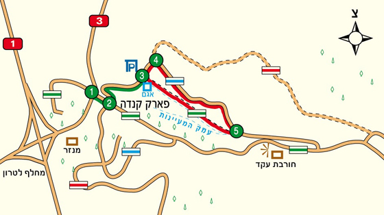 מסלול הטיול שלנו מתחיל בחניון האגם המלאכותי שבפארק קנדה |3|. מהחניון המסודר, שבו משטחי דשא, שולחנות פיקניק מוצלים ואגם מלאכותי, נצא בכביש המסומן בכחול לכיוון צפון. הכביש המשובש מעט עולה בעלייה מעט תלולה לאורך כ-100 מטר, ולאחר מכן, במפגש עם שביל רחב המסומן באדום, מתעקל בחדות ימינה |4|. אנו פונים ימינה בעקבות הכביש המסומן בכחול, וממשיכים לעלות, הפעם במתינות, בכביש החשוף לשמש. הכביש המשובש מתעקל לימין ולשמאל, מצדנו הימני נוכל לראות מבעד לעצים את העמק שנלך בו בהמשך המסלול, ולאחר כ-30 דקות הליכה נגיע למפגש עם שביל המסומן בירוק |5|, ונפנה אליו ימינה. השביל המסומן בירוק מתחיל כשביל רחב והופך מיד לשביל צר, המתעקל ימינה ויורד בירידה מתונה אל “עמק המעיינות” החלק המרכזי במסלול שלנו. לאורכו של “עמק המעיינות” התגלו שרידים עתיקים ומעניינים ממערכת המים של העיר הרומית אמאוס, ששכנה בקרבת מקום לפני יותר מ-1,500 שנים. העיר אמאוס, שמוקמה משיקולים אסטרטגיים על אם הדרך לירושלים, מוזכרת בברית החדשה כמקום מפגשו של ישו עם שניים מתלמידיו לאחר שקם לתחייה ובספרי המכבים כמקום שנערך בו אחד הקרבות המשמעותיים בין המכבים ליוונים, עליו נוכל לספר לילדים (ראו במסגרת: “שעת סיפור”).