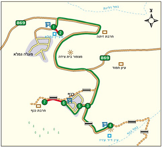 נקודת מוצא וסיום: חלקו הראשון של המסלול מתחיל ומסתיים על כביש הגישה ליישוב מעלה גמלא, חלקו השני כולל נסיעה והליכה קצרצרה בסמוך ליישוב כנף, וחלקו השלישי מתחיל ומסתיים בתוך היישוב כנף