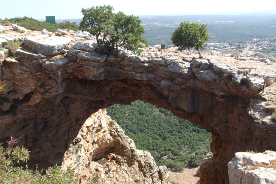 מהמצפה נמשיך בשביל המתון שאינו מוצל, על אדמת טרשים, עד שנגיע כעבור 5 דקות אל מערת קשת |6|. זוהי בעצם קשת ענקית ורחבה, התלויה באוויר, ותחתיה תהום עמוקה. בעבר הייתה המערה סגורה מכל עבריה, אלא שתהליכים גיאולוגיים חשפו את פתחה הדרומי, התמוטטות פערה את תקרתה, וכל מה שנותר כיום היא קשת סלע מיוחדת במינה. בתחילה נעבור על הקשת הרחבה, לצד שני עצים, ובהמשך נקיף אותה ונגיע לתצפית על הקשת הגדולה ועל ההרים הירוקים שמאחוריה, הנראים דרך פתח המערה. המראה המיוחד שובה עין, ואפשר לשבת ולהביט במערה דקות ארוכות, ולספר לילדים סיפור על היווצרותה (ראו במסגרת: “שעת סיפור”). בימי שבת וחג פועל במקום בדרך כלל מדריך סנפלינג, והאמיצים שמביניכם יוכלו לגלוש בעזרת חבלים עד לתחתית המערה. מכאן נחזור בשביל הצר המסומן בירוק, שהופך במהרה לשביל אספלט צר ומסודר, אל חניון מערת קשת (כ-5 דקות הליכה) |3| נקודת הסיום של חלקו הראשון של המסלול. מכאן ניסע אל חלקו השני של המסלול.