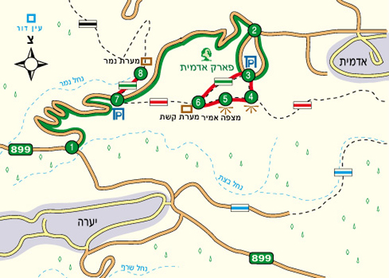 מגיעים לצומת כברי שבמפגש כביש 70 עם כביש 89, ופונים בה צפונה בכביש 70 לכיוון שלומי. לאחר כ-7 קילומטר פונים בצומת חניתה ימינה לכביש 899. חולפים על-פני היישוב מצובה, ולאחר כ-2.5 קילומטר פונים שמאלה (צפונה) |1| לכביש צר, לכיוון אדמית ועַרַמְשָה. עולים בזהירות בכביש המפותל והיפהפה, לאחר כ-2.5 קילומטר חולפים על-פני מפרץ חנייה מצד ימין של הכביש |7|, שאליו נחזור בהמשך, וממשיכים ישר. לאחר מעט יותר מקילומטר וחצי פונים ימינה לפארק אדמית |2|, על-פי השלט, ונוסעים בכביש הצר בתוך הפארק עד לחניון מערת קשת שבקצהו |3|– נקודת ההתחלה והסיום של חלקו הראשון של המסלול.