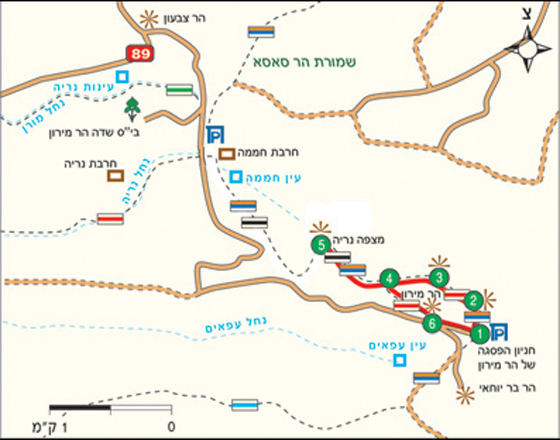 את המסלול נפתח בחניון הפסגה של הר מירון |1|. מחלקו הצפוני של החניון יוצא שביל מסומן בסימון שביל ישראל ובסימון אדום, המכונה “שביל הפסגה” של הר מירון. השביל מקיף במעין טבעת את פסגת ההר (שעליה נמצא בסיס צבאי, שהכניסה אליו אסורה) ומספק תצפיות מרהיבות על הרי הגליל והגולן. השביל מתחיל במגמת עלייה קלה, בין עצים ואבנים, וכבר אחרי 5 דקות אנו מגיעים אל המצפה הראשון לכיוון דרום ומזרח |2|, שממנו ניתן לראות את צפת ורכס הר כנען. לאחר מנוחה קצרה במצפה נמשיך בהליכה בתוך החורש כ-10 דקות נוספות עד למצפה השני |3|, המשקיף צפונה ומזרחה. ממצפה זה רואים חלק נרחב מיישובי הגליל העליון, את רמות נפתלי וביום בהיר גם את הרי הגולן והחרמון. לצד המצפה מספר סלעים גדולים הנמצאים בצל העצים ומזמינים אותנו למנוחה קצרה. כאן אפשר לספר לילדים סיפור על הר מירון (ראו במסגרת: “שעת סיפור”), ומכאן ממשיך השביל לכיוון צפון-מערב, בעליות ובירידות קלות. אוויר פסגות קריר ונעים מלווה אותנו בכל זמן ההליכה בשביל.
