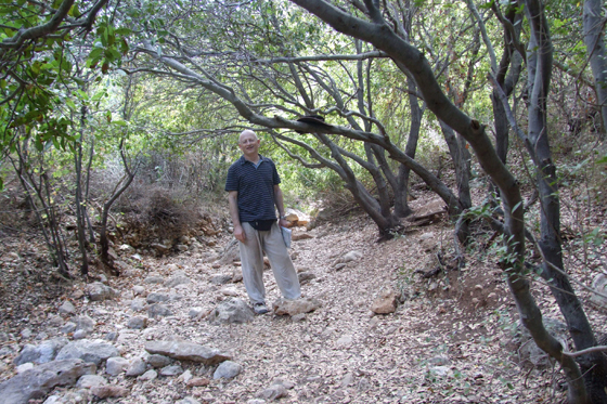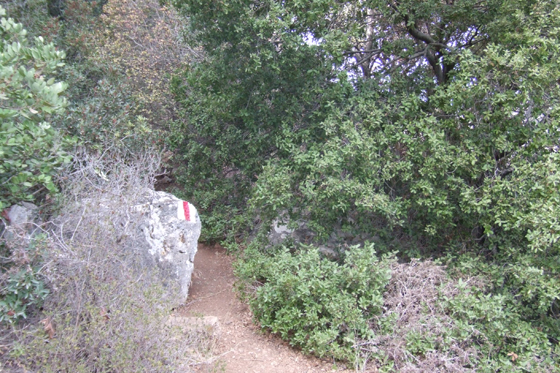 אחרי שנעבור את הספסל, מתעקל השביל שמאלה ומתחיל לרדת במתינות. השביל הופך רחב יותר, וכעבור מספר דקות נעבור ליד אמפיתיאטרון קטן |4|, המשקיף גם כן על נוף מפרץ חיפה ורכס הכרמל, וליד תצוגה נוספת של כלים עתיקים. לאחר מכן נראה גם עבודה יפה בה מוצגים שמות העצים שאפשר לפגוש לאורך המסלול, עם מידע כללי מעניין אודותיהם. נמשיך ללכת בשביל המתפתל לכיוון דרום, נהנה מהעצים והצמחייה שמקיפה אותו, ומהשלווה ששוררת כאן. לאחר כ-10 דקות הליכה, נגיע לפיצול שבילים נוסף |5|: שביל מסומן באדום, המכונה גם “שביל הנוער”, פונה ימינה ויורד לעבר שביל ישראל המתפתל בערוץ הנחל שלמטה, ואילו אנו ממשיכים ישר בשביל המסומן בכחול.