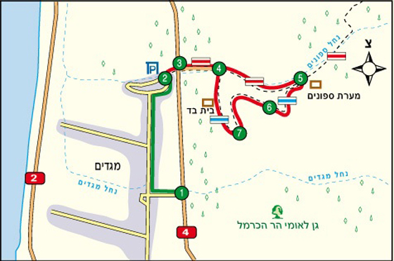 מגיעים לצומת אורן שבכביש 4, ופונים צפונה לכיוון חיפה. לאחר כ-2 קילומטר פונים שמאלה על פי השילוט למושב מגדים |1|, במעגל התנועה שבכניסה למושב פונים ימינה ונוסעים ישר עד לצומת T. בצומת פונים שוב ימינה ונוסעים בכביש המתעקל בחדות שמאלה. ממשיכים בנסיעה, עד שרואים שביל עפר ראשון שפונה ימינה |2|, לצדו חונים את המכונית – נקודת ההתחלה והסיום של המסלול.