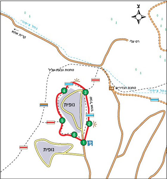 השביל יורד מעט ואז עולה במתינות, משקיף על חלקו הדרומי החדש של היישוב נופית, וכעבור מספר דקות נכנס לתוך היישוב |6|. כעת מצפה לנו עלייה בכמה עשרות מדרגות עד למפלס הרחוב הראשי. נעלה לאט לאט, ובקצה העלייה נגיע לרחוב איתנים. נפנה ימינה ברחוב המשולב, נלך כ-10 דקות בין בתי היישוב, עד שנגיע חזרה לרחוב הגליל. נפנה שמאלה, ומידע נגיע אל המכונית הממתינה לנו בנקודת הסיום של המסלול |1|.