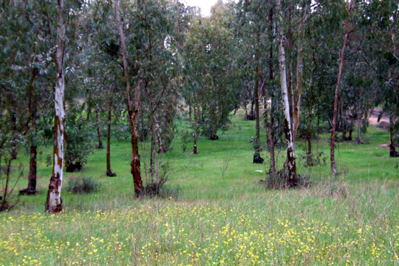 הולכים בשביל רחב בין איקליפטוסים ומרבדים צהובים-ירוקים