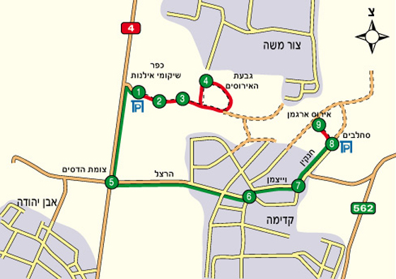 השביל המתון אינו מוצל, מתפתל ומקיף את הגבעה, ובכל רגע אפשר לעצור, להביט ולצלם את הפרחים הנדירים, וגם לספר לילדים סיפור על האירוס (ראו במסגרת: “שעת סיפור”). ההליכה בשביל האירוסים נמשכת כ-15 דקות, ובקצה השביל שלטים וחיצים ברורים המפנים אותנו אל היציאה. הליכה מתונה ומוצלת של כ-10 דקות בחורשת האיקליפטוסים תוביל אותנו אל פיצול השבילים שבו היינו קודם לכן |3|. ממפגש השבילים נחזור באותה הדרך שהגענו בה אל המכונית |1|, וניסע אל חלקו השני של המסלול, בשמורת קדימה.